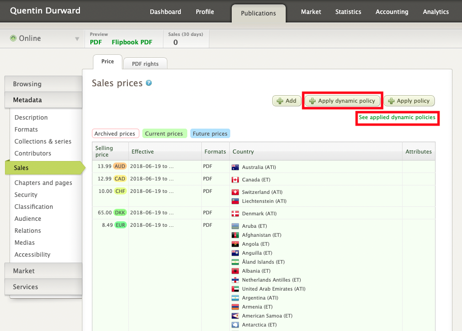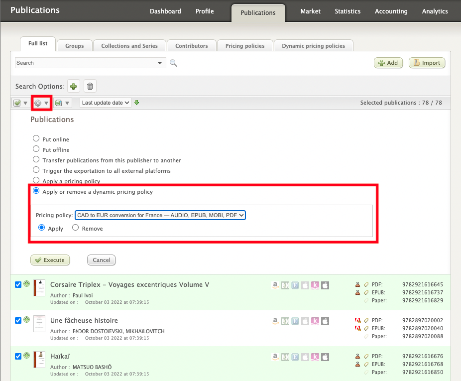 Once configured, the pricing policy will automatically apply to the next publications added to the catalogue. However, it is possible to activate it on all or some of the previous publications that are already in the digital warehouse.