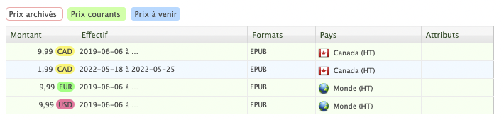 Ainsi, dans la section Métadonnées/Ventes, à l'onglet Prix, vous observerez une ligne présentant une couleur de fond verte (prix actif) et une ligne présentant la couleur de fond bleue (prix promotionnel futur).